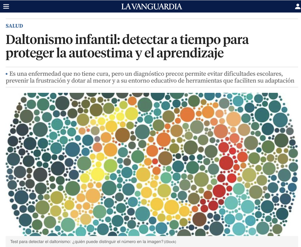 Hoy queremos compartir una noticia que nos llena de orgullo. El diario La Vanguardia ha publicado un artículo sobre el daltonismo infantil en el que participa nuestro especialista, el Dr. Yasser Guerrero, aportando su conocimiento y experiencia en el diagnóstico y manejo de esta condición visual en niños.